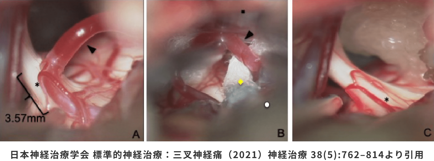 下図は、左三叉神経痛に対する手術の様子です。Aでは、▲で示された血管(上小脳動脈)が、*で示された三叉神経に当たっており、痛みの原因となっています。Bのように緩衝材(黄色の◆)を用いて血管を移動させ、Cのように別の場所に固定することで、血管が神経に当たらないようにします。この治療の効果が出ると、手術の直後から痛みがなくなります。